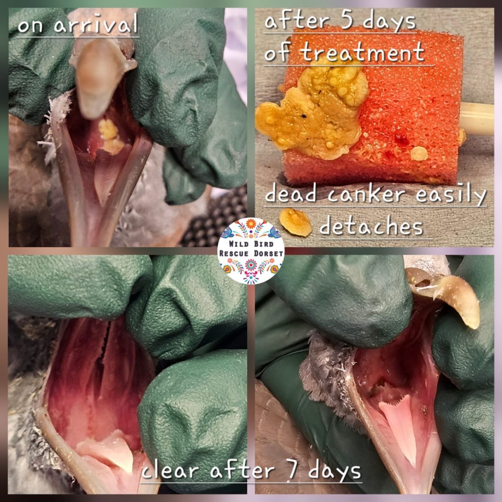 We’ve been seeing a lot of pigeons coming in with canker, also known as trichomoniasis. It’s a very common but very serious parasitic infection that creates yellowish growths in the throat and crop.